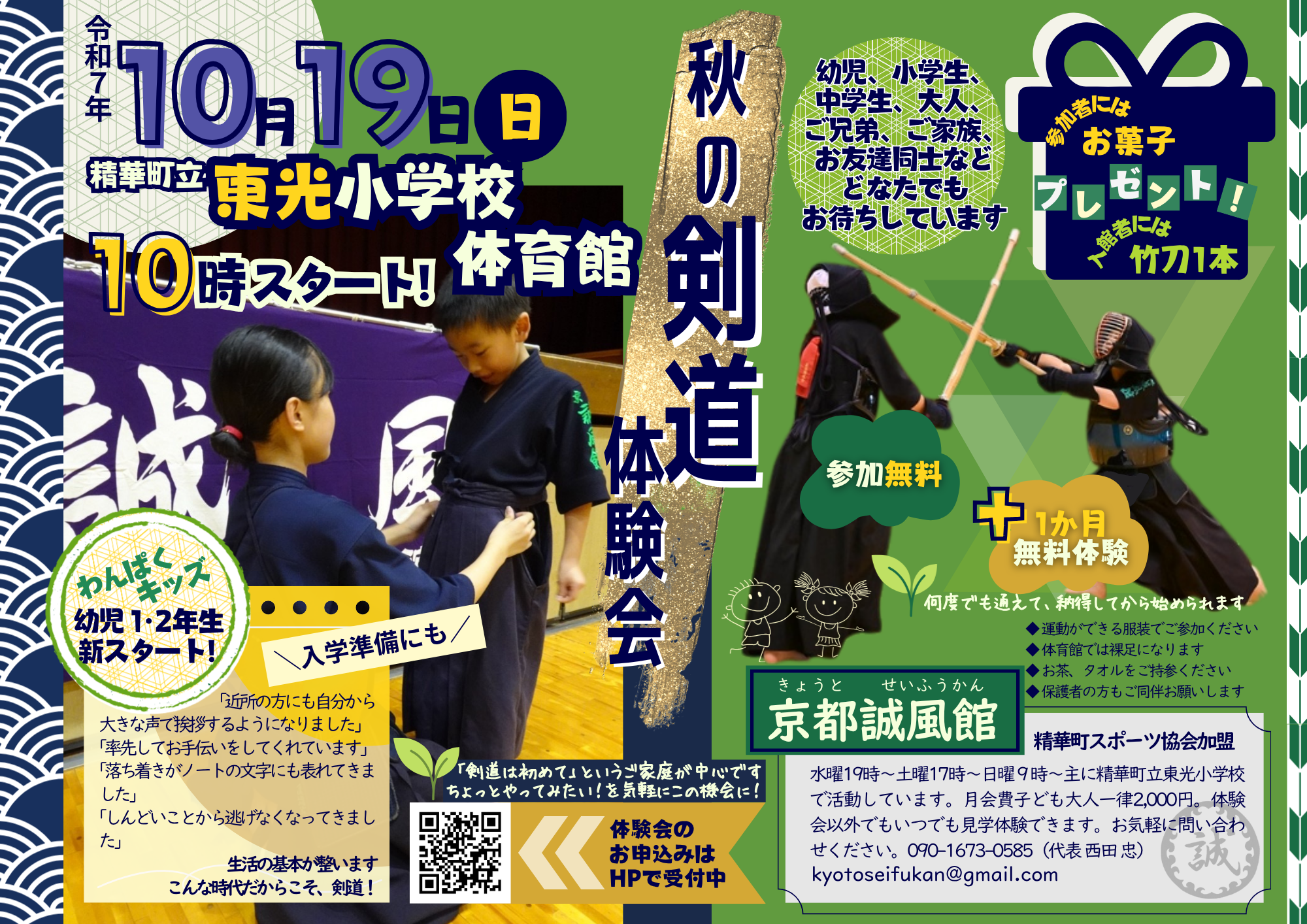 昭和32年創立の剣道道場・京都誠風館は、子ども46名、大人40名(令和7年9月現在)が在籍する、京都府下で道場生最多の、活気と歴史ある道場です。精華町、木津川市、京田辺市、生駒市などから幼児、小学生、中学生、大人の道場生が集まり、精華町立東光小学校を拠点に活動しています。